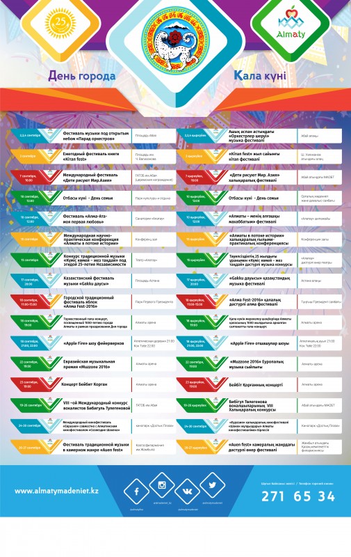 Кроме того, в рамках празднования  Дня города алматинцев ожидают ежегодный фестиваль книги "Kiтап Fest" (3 сентября) , праздник "День семьи" (10 сентября), VIII Международный конкурс вокалистов Бибигуль Тулегеновой (19-26 сентября)  и множество концертов на открытых площадках.