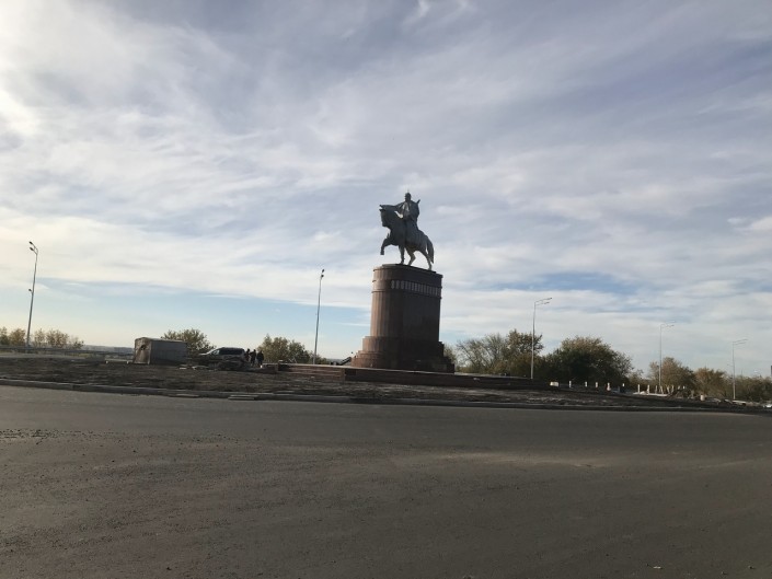 На въезде в город со стороны столицы установили новый памятник Кожабергену жырау. Бронзовый всадник на коне пока накрыт материей.