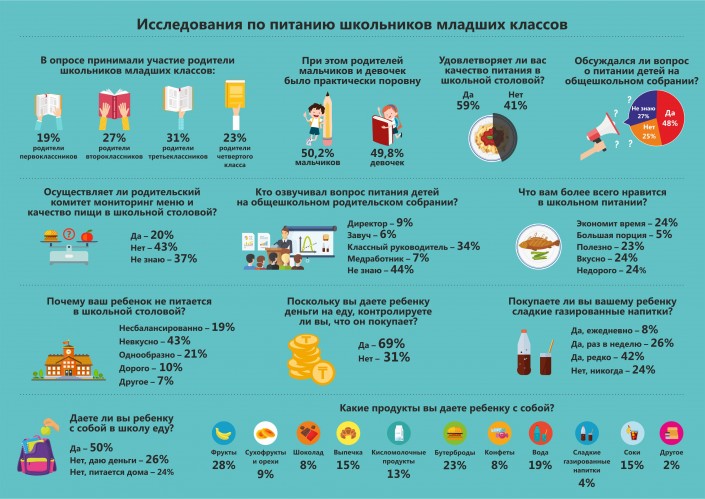 Из опрошенных около 60 процентов заявили, что их дети питаются в школьных столовых. Однако при этом около 25 процентов опрошенных утверждают, что вопрос школьного питания не обсуждается на родительских собраниях, и почти 43 процента считают, что родительский комитет никак не контролирует качество питания в школьных столовых.
