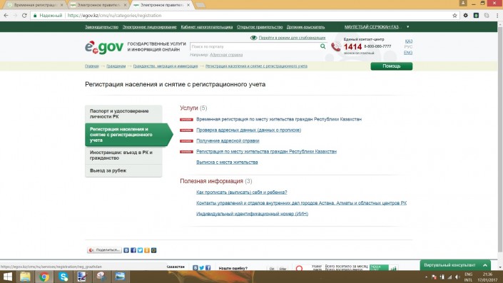 Затем выбираем подраздел "Регистрация населения и снятие с регистрационного учета". С правой стороны появится список услуг. Здесь нужно нажать "Временная регистрация по месту жительства граждан РК".