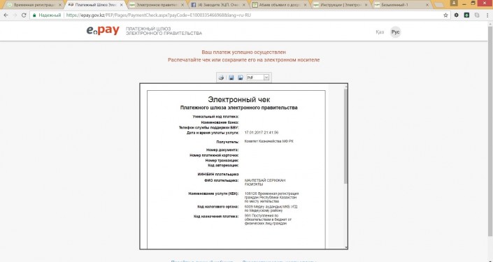 В результате оплаты предоставляется электронный чек, который можно сохранить на компьютере. На странице с электронным чеком нужно, для продолжения, нажать кнопку "Перейти в личный кабинет".