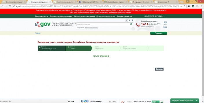 После этого в меню "Временная регистрация граждан Республики Казахстан по месту жительства" появится сообщение "Услуга оплачена". Нужно нажать кнопку "Дальше".