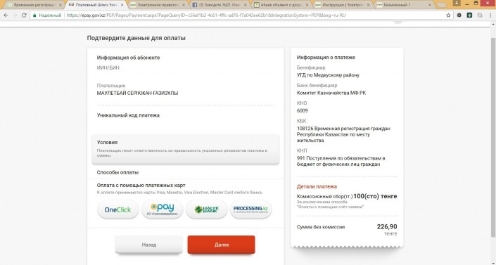 После этого появляется меню, в котором можно выбрать способ оплаты. На текущий момент доступна оплата посредством систем OneClick, ePay Qazkom, Halyk Bank и Processing.kz. Сумма составляет 326,9 тенге. В нее входит госпошлина в 226,9 тенге и комиссия в 100 тенге.