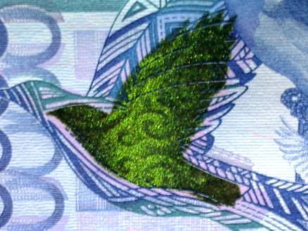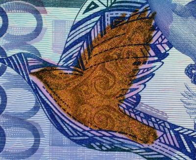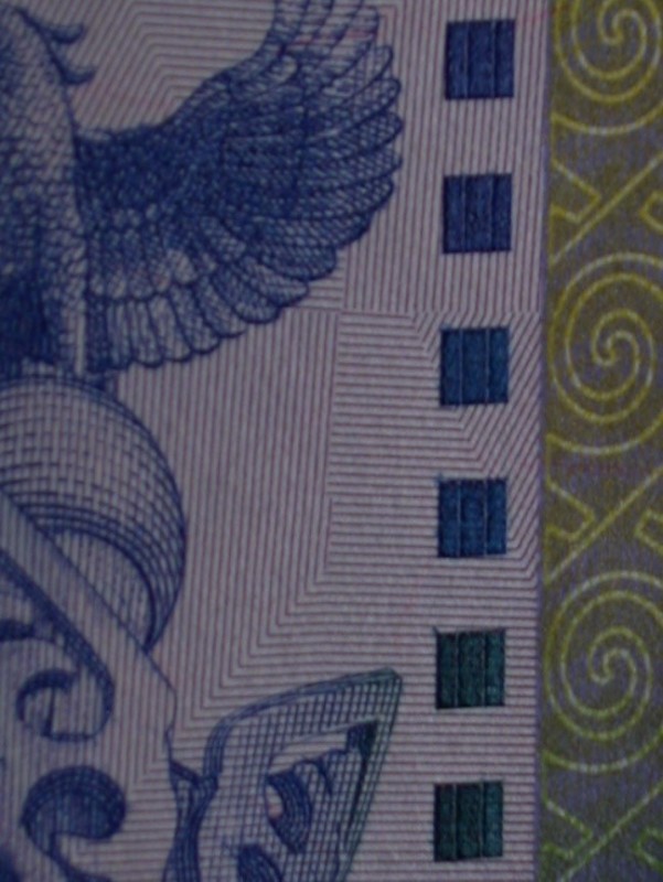 -защитный элемент в виде изображения голубя при изменении угла наклона меняет цвет с зеленого на золотой;