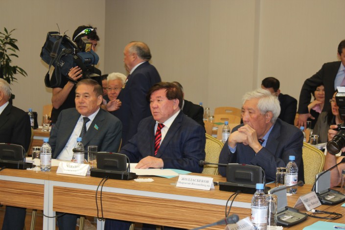 Депутат Сената Парламента Куаныш Айтаханов, главный редактор журнала "Жалын" Мухтар Шаханов, общественный деятель, академик Национальной академии наук Мырзатай Жолдасбеков.