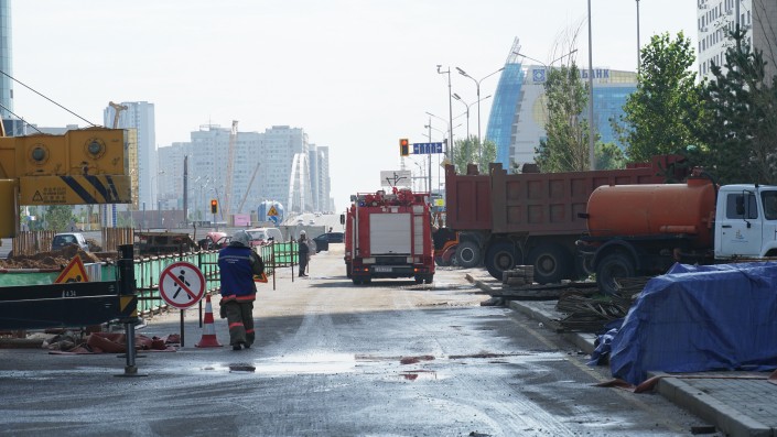 "Бывают такие моменты. 33-й этаж, при подаче очень высокое давление. Под давлением пожарный рукав может лопнуть. Наши бойцы сразу же меняют их и дальше продолжают тушить", - пояснил Серик Кожаханов.