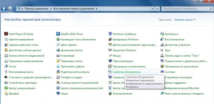 выбрать там пункт "Сеть и Интернет". Далее необходимо перейти к "Управлениям настройками браузера", затем к "Свойствам обозревателя".
