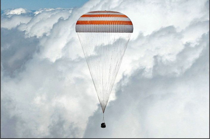 Тимоти Пик, Юрий Маленченко и Тимоти Копра приземлились в спускаемой капсуле.