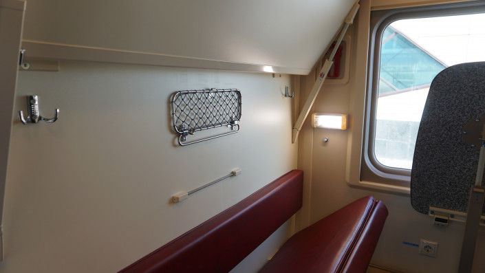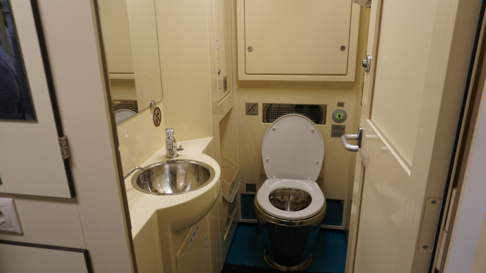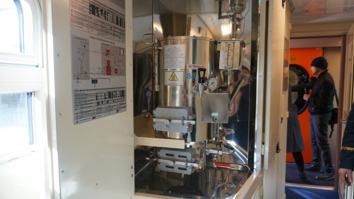 Автономно работают два биотуалета, которые экипируются 1200 литрами воды. Для проводника есть душевая кабина.