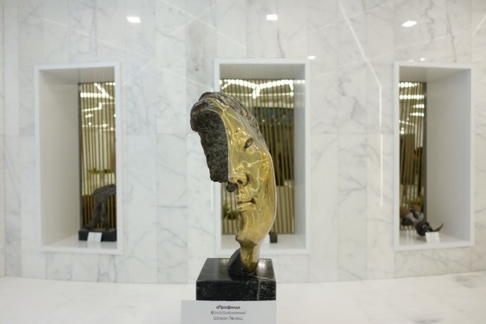 Дополняет новый дизайн установленная на верхней точке монумента люстра, выполненная в виде летающих сказочных птиц Самрук.
