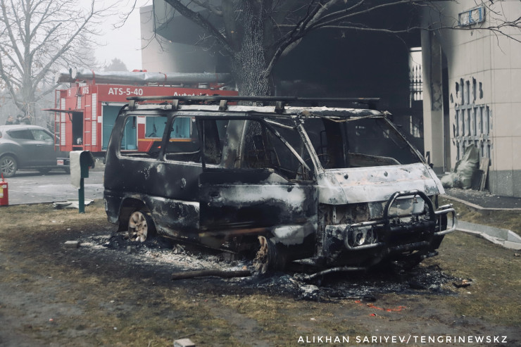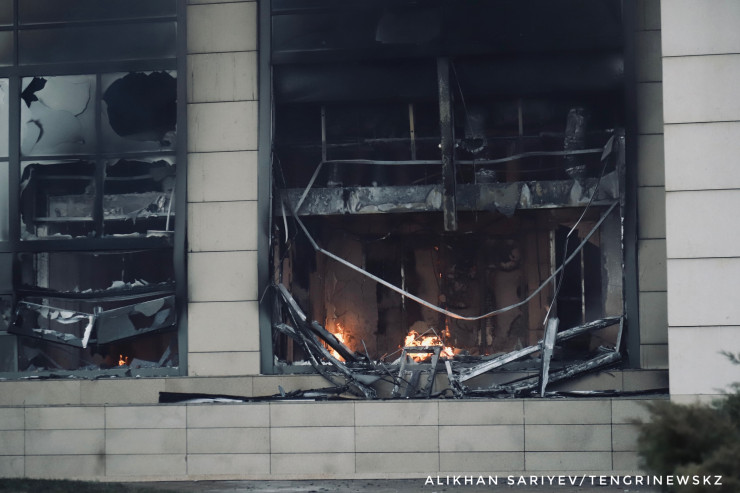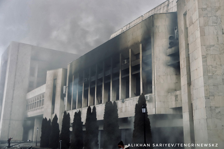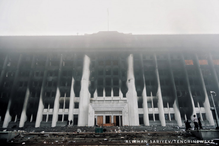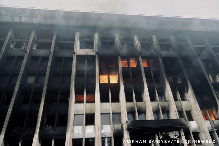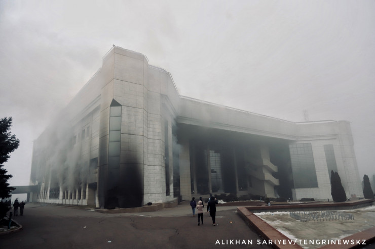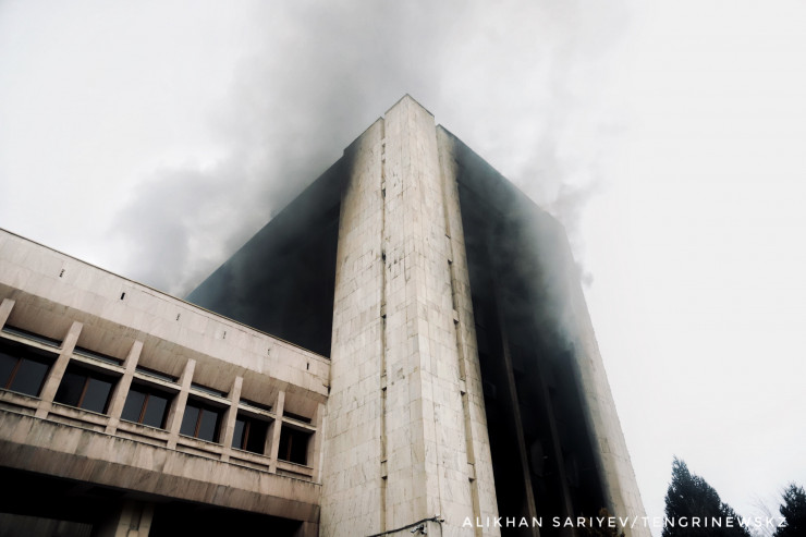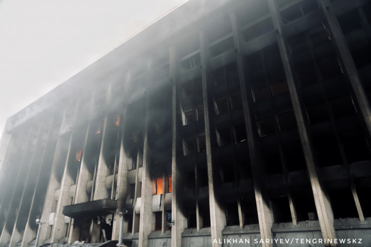 По словам корреспондента, здание городского акимата Алматы 6 января продолжало дымиться и гореть.