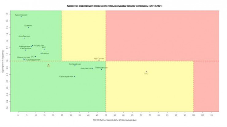 Опубликована матрица оценки эпидемиологической ситуации в регионах Казахстана на 26 декабря, передает Tengrinews.kz со ссылкой на Telegram-канал Межведомственной комиссии по нераспространению коронавируса.