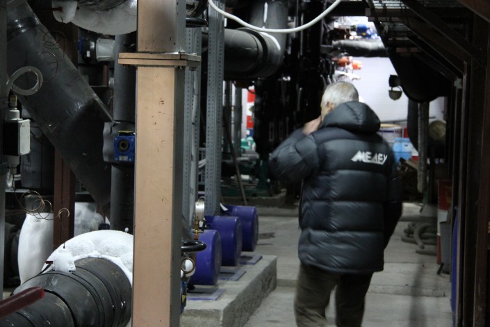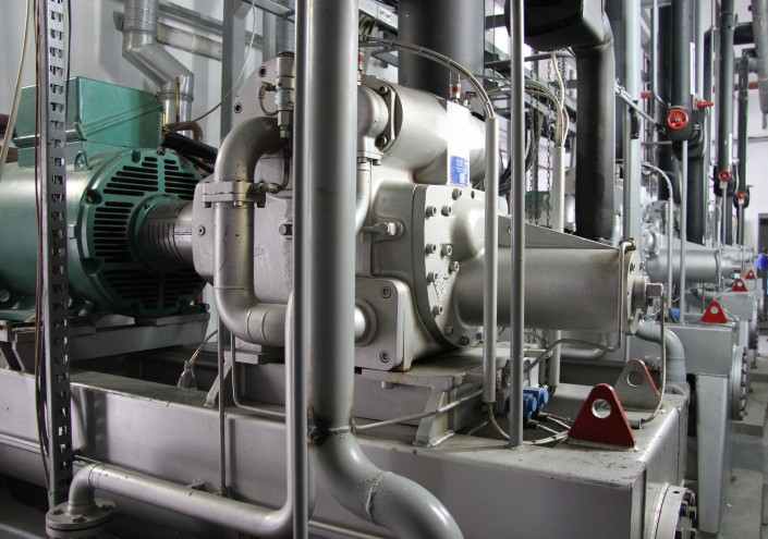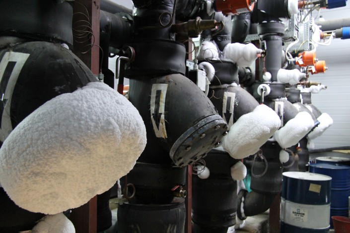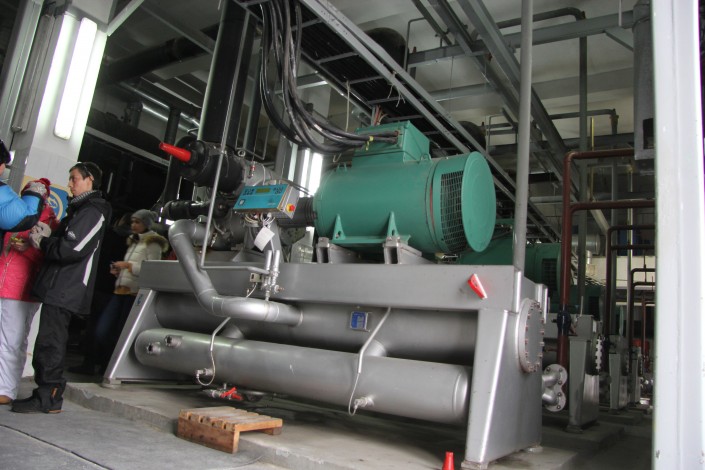 В машинном зале находится станция, которая охлаждает лед для высокогорного катка. За ночь морозильное оборудование, которое располагается в двух больших павильонах, успевает полностью выработать лед на следующий день. Стоит подчеркнуть, что в данное помещение пропуск имеют только инженеры.