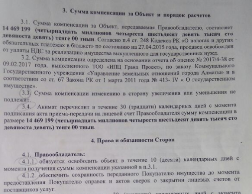 В целом он отметил, что в указанных выше пунктах договора от акимата ничего взаимоисключающего или неграмотного нет. Единственно, по выражению Каплана, можно сказать, что они "не совсем человечные". Акимат действительно не особо волнует, куда будут съезжать люди, но с точки зрения административно-властно-подчиненных отношений, это допустимо, что в Казахстане частое явление.