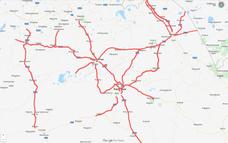 - Нур-Султан - Кабанбай батыр - Киевка - Темиртау, километры 51-266, участок от границы Акмолинской области до Темиртау;
