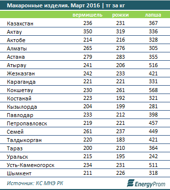 "Дороже всего вермишель и рожки обошлись жителям Актау (350 и 319 тенге за килограмм, плюс 17,4 процента и плюс 15,6 процента соответственно). Лапша больше всего стоила в Кокшетау (568 тенге за килограмм, плюс 2,7 процента за год). Самые низкие цены на вермишель отмечены в Таразе (200 тенге за килограмм, плюс 7,5 процента за год), на рожки - в Талдыкоргане (183 тенге за килограмм, плюс 13,7 процента), на лапшу - в Уральске (242 тенге за килограмм, плюс 12,6 процента)", - подытожили эксперты.