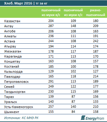По информации аналитиков, предприятия-производители продавали в марте 2016 года ржаной хлеб по 159 тенге за килограмм (на треть дороже, чем в марте 2015 года), пшеничный - по 101 тенге за килограмм (плюс 8,2 процента за год), ржано-пшеничный - по 165 тенге за килограмм (на 9,1 процента дешевле, чем годом ранее).