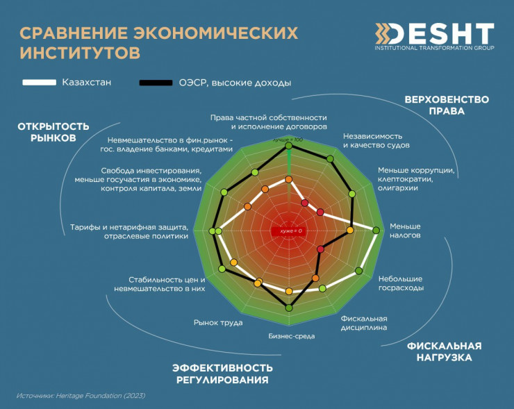 Такое экономическое наследство осталось от "старого Казахстана", несмотря на "Казахстан-2050", "100 шагов" и многое другое. Вот как косвенно описывается ситуация в Казахстане в отчете: "Несмотря на некоторые подвижки, в последние десятилетия институциональные недостатки, такие как слабая судебная система и повсеместная коррупция, дестимулировали диверсификацию и модернизацию", - заключили в Desht.