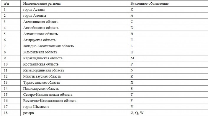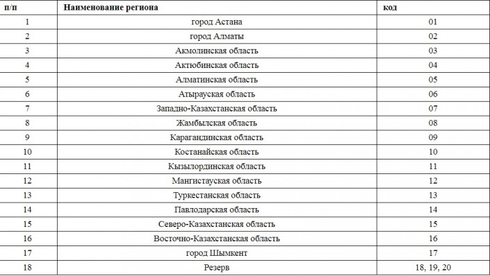 Перечень цифровых кодов областей и городов Республики Казахстан, применяемых на государственных регистрационных номерных знаках: