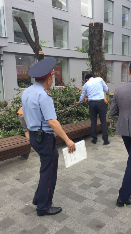 Как уточнили в городской администрации, информация о сносе деревьев на Арбате поступила 12 июля 2018 года. Сотрудники Управления природных ресурсов и регулирования природопользования Алматы, представители природоохранной полиции МПС ДВД Алматы, сотрудники отдела благоустройства и отдела охраны окружающей среды и экологии аппарата акима Алмалинского района выехали на место.