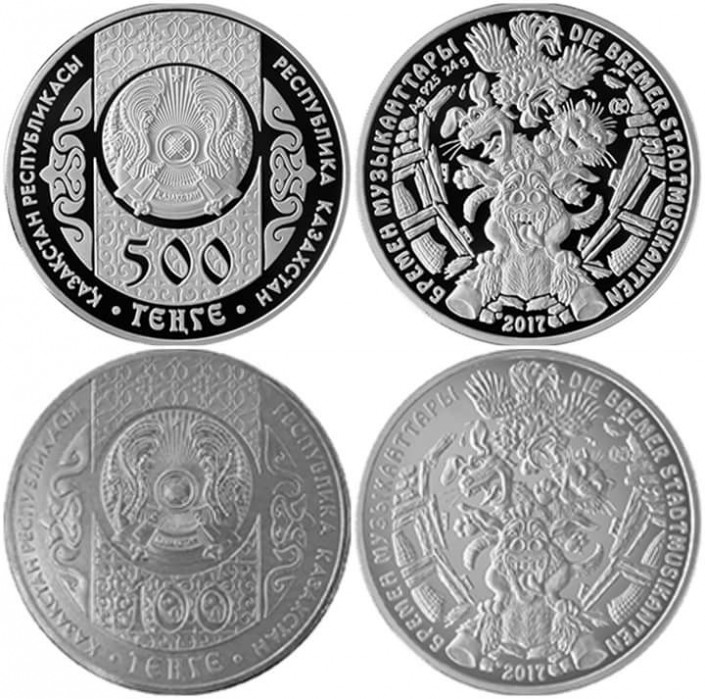 Памятные монеты выпущены в двух видах: из серебра номиналом 500 тенге и из сплава нейзильбер номиналом 100 тенге. На них изображены главные герои сказки - осел, собака, кот и петух, которые отправляются в город Бремен, чтобы стать городскими музыкантами. Монеты из серебра и сплава нейзильбер имеют идентичные изображения лицевых и оборотных сторон. Монеты выпущены в ограниченных количествах.