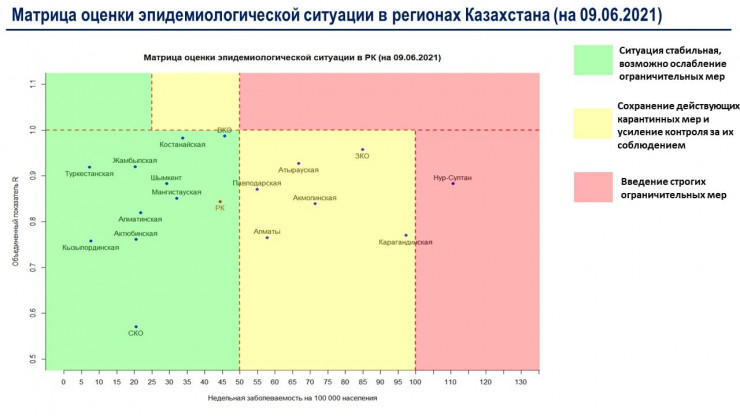Согласно матрице оценки эпидемиологической ситуации в регионах Казахстана на 9 июня, в "красной" зоне по-прежнему остается Нур-Султан.