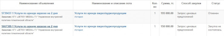 16 февраля на сайте госзакупок государственное предприятие объявило о приеме заявок по аренде караоке на два дня. Ориентировочная цена за эту услугу составила 195 тысяч тенге.