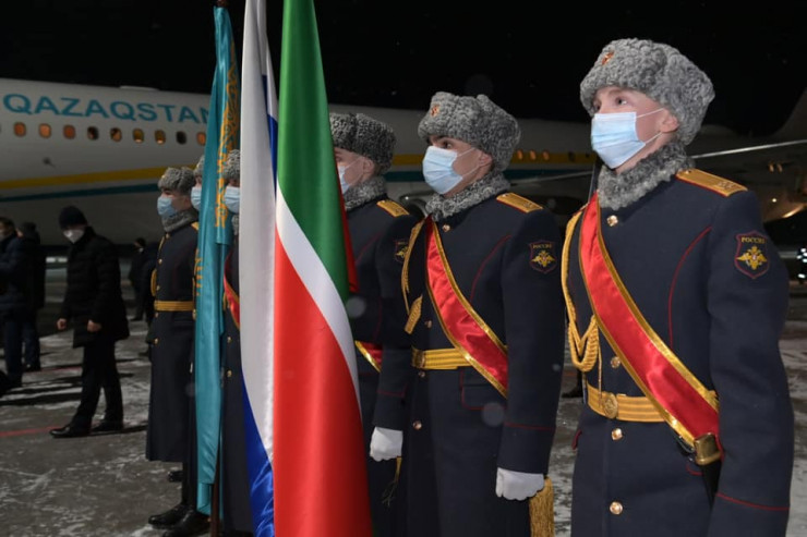В международном аэропорту Казани казахстанского лидера приветствовал президент Татарстана Рустам Минниханов.