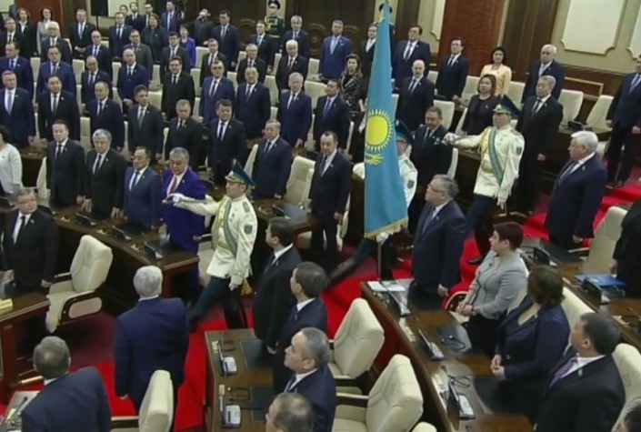 12.00 Церемония начинается. В зал заседаний Мажилиса вносят флаг Казахстана и Конституцию.