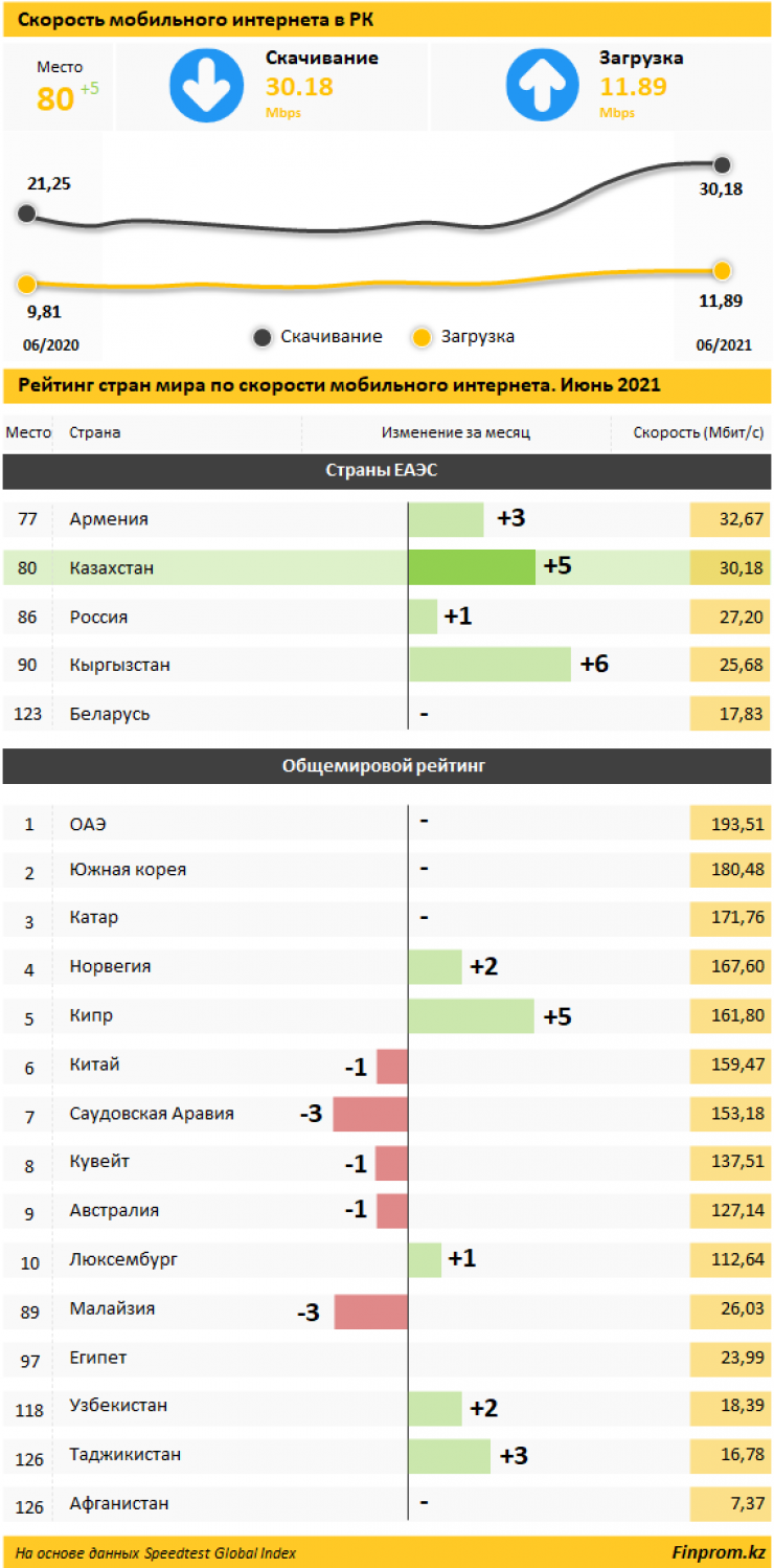 В рейтинге стран по скорости мобильного интернета в июне 2021 года Казахстан занял 80-е место. Это на пять позиций лучше, чем месяцем ранее, и на 15 мест, чем годом ранее. Скорость мобильного интернета достигла 30,18 мегабит в секунду. В июне прошлого года этот показатель составлял 21,25.