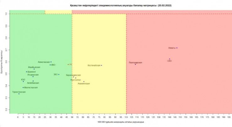 Согласно матрице оценки эпидемиологической ситуации, в "красной" зоне: Алматы, Павлодарская, Северо-Казахстанская области.