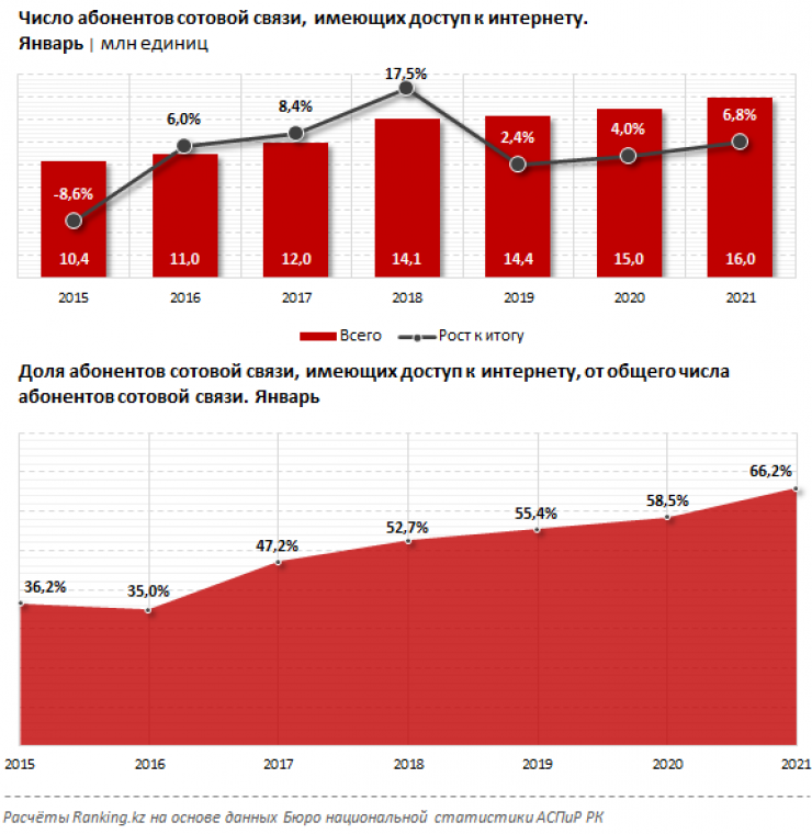 Число абонентов сотовой связи, имеющих доступ к интернету, в Казахстане достигло 16 миллионов единиц. Это на 6,8 процента больше, чем годом ранее. Доля абонентов с доступом к интернету составила уже 66,2 процента от общего числа абонентов сотовой связи. Отмечается, что при этом всего пять лет назад показатель достигал лишь 35 процентов.