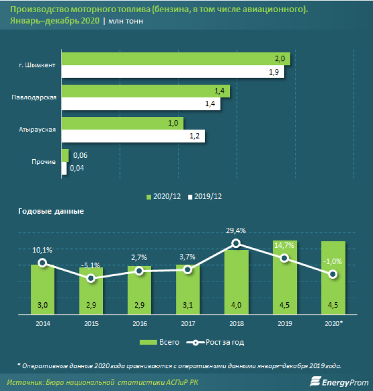 Сообщается, что за январь - декабрь 2020 года в Казахстане произвели 4,5 миллиона тонн бензина - почти столько же, сколько в аналогичном периоде годом ранее.