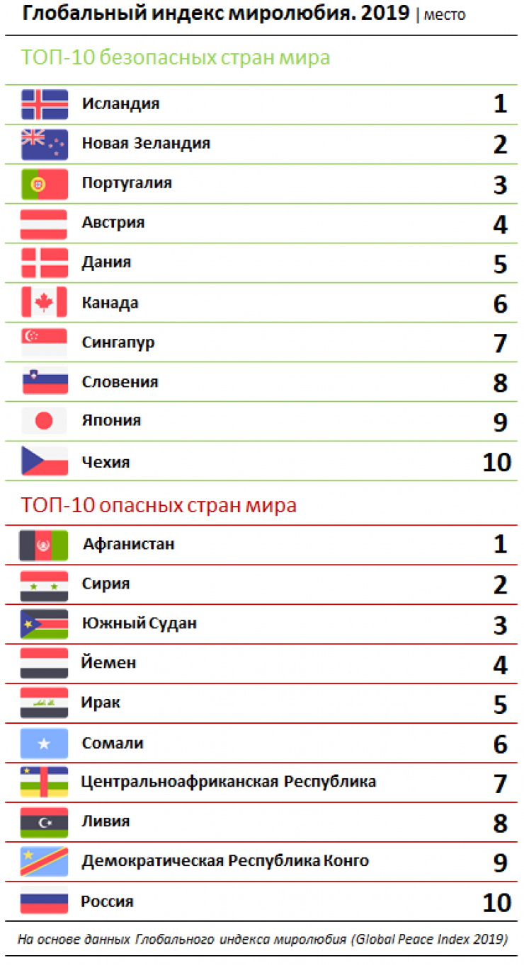 Всего в рейтинг вошли 163 страны. Самыми безопасными странами для проживания являются Исландия, Новая Зеландия, Португалия, Австрия и Дания. В десятке также Канада, Сингапур, Словения, Япония и Чехия. В конце рейтинга оказались такие страны, как Афганистан, Сирия, Южный Судан, Йемен и Ирак. Стоит отметить, что в десятку самых опасных стран вошла и Россия.