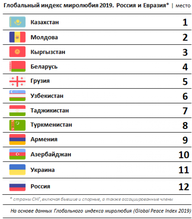 Также на основе данных Глобального индекса миролюбия составлен отдельный рейтинг среди 12 стран, относящихся либо относившихся ранее к СНГ. В нем Казахстан занял первое место. Молдова и Кыргызстан поделили между собой вторую и третью позицию. Последнее место среди этих стран заняла Россия.