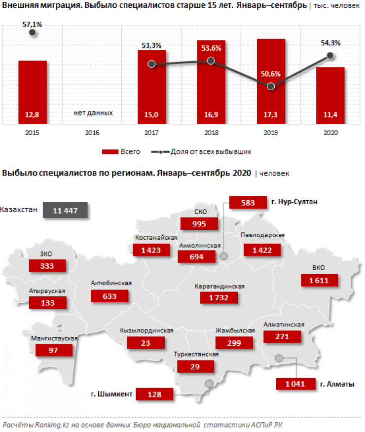 С учетом закрытых из-за пандемии границ это на 33,8 процента меньше, чем в аналогичном периоде годом ранее. Заметим: при этом доля специалистов от всех покинувших Казахстан составила 54,3 процента, против 50,6 процента годом ранее.