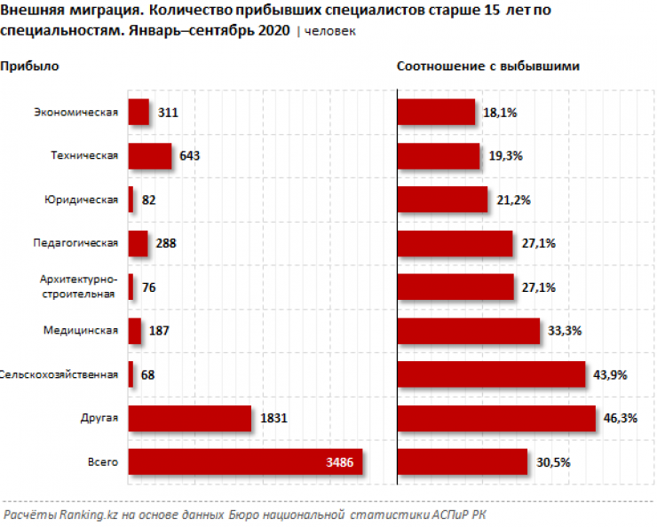 Прибыло в Казахстан за январь - сентябрь 2020 года лишь менее 3,5 тысячи специалистов. То есть новоприбывшие не перекрыли трети выбывших кадров.