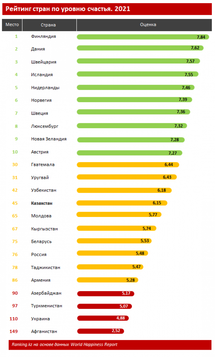 Казахстан занял 45-е место в международном рейтинге стран по уровню счастья (World Happiness Report). За год страна поднялась на пять позиций, передает корреспондент Tengrinews.kz со ссылкой на ranking.kz.
