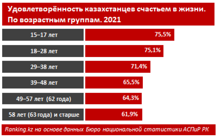 Также уровень счастья среди опрошенных отличается по возрастным категориям. Среди казахстанцев от 15 до 17 удовлетворены счастьем 75,5 процента, среди граждан от 18 до 28 - 75,1 процента, в возрасте от 39 до 48 лет - 65,5 процента, а среди пенсионеров - всего 61,9 процента.