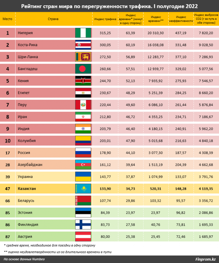В рейтинге худших стран по перегруженности трафика Казахстан занял 47-е место из 87. Индекс трафика страны составил 133,9. Индекс оценивает время, затраченное на поездку на работу, неудовлетворенность из-за длительных поездок на работу, неэффективность системы дорожного движения и потребление CO2 (углекислого газа), передает Tengrinews.kz со ссылкой на аналитический портал Finprom.kz