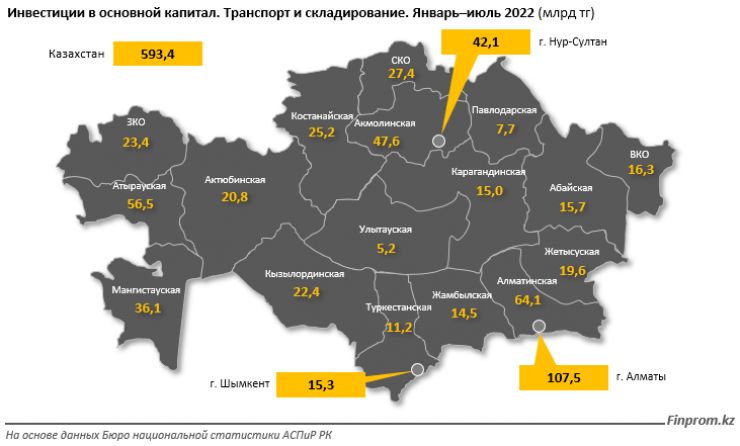 За январь – июль текущего года инвестиции в основной капитал в транспортно-логистической сфере составили в Казахстане 593,4 миллиарда тенге - на 7,8 процента больше в стоимостном выражении, чем годом ранее (реальный рост физического объема - на 5,2 процента).