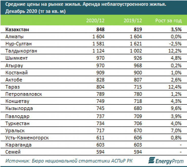 Самые высокие цены на неблагоустроенное жилье наблюдаются в Алматы (1,6 тысячи тенге), Нур-Султане (1,6 тысячи тенге) и Талдыкоргане (1,1 тысячи тенге за квадратный метр).