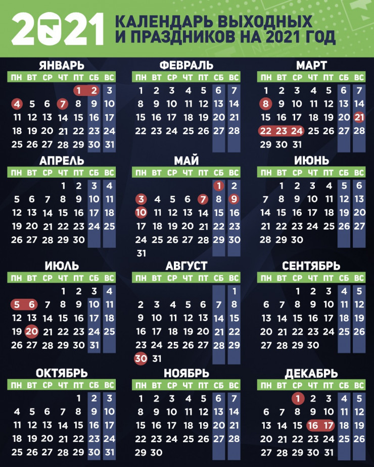 В 2021 году жителей страны ждут 245 рабочих и 120 выходных дней. Больше всего выходных выпало на январь и май.