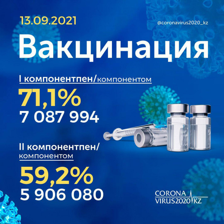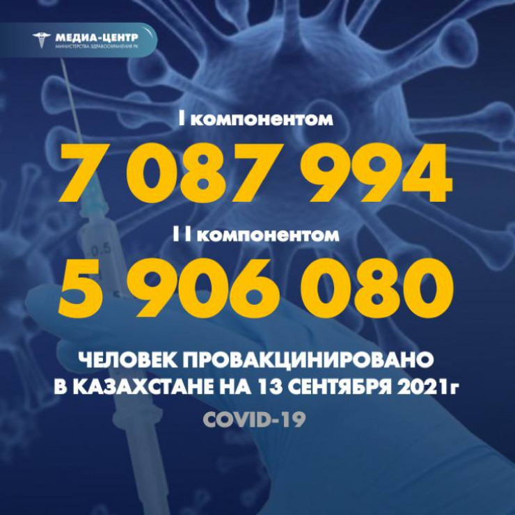 По данным Минздрава на 13 сентября, первым компонентом вакцины от коронавируса вакцинировали 7 087 994 человека, вторым компонентом - 5 906 080 человек.
