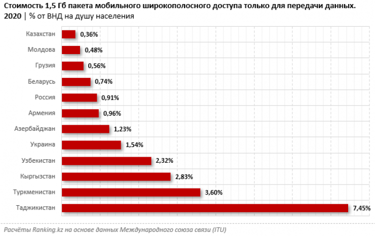 Также в Казахстане широкополосный мобильный интернет считается одним из самых доступных в мире. Стоимость пакета, по данным ITU за 2020 год, составляет лишь 0,36 процента от валового национального дохода на душу населения за 1,5 гигабайта мобильного широкополосного доступа. Среди стран СНГ у Казахстана лучшие показатели, для сравнения, в России стоимость пакета составляет 0,91 процента от валового нацдохода.