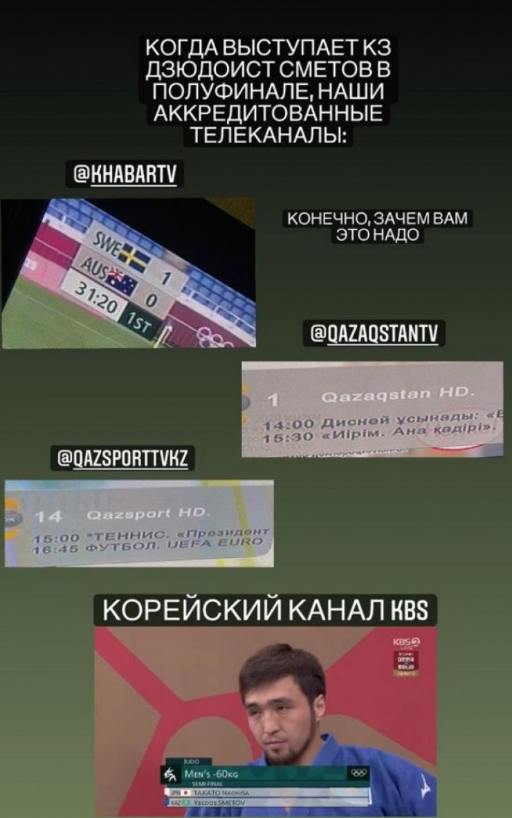 Телеканал "Хабар" также в Instagram извинился перед зрителями, предупредив, что не покажут финал по дзюдо "по техническим причинам".