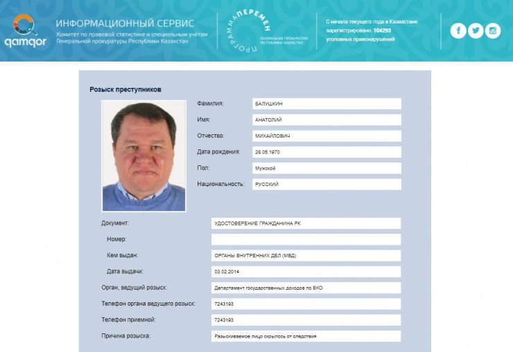 Объявление о розыске бизнесмена появилось на сайте Комитета по правовой статистике и специальным учетам Генеральной прокуратуры в разделе "розыск преступников". О причинах объявления в розыск не сообщается, однако, по данным сайта, Балушкин скрылся от следствия.