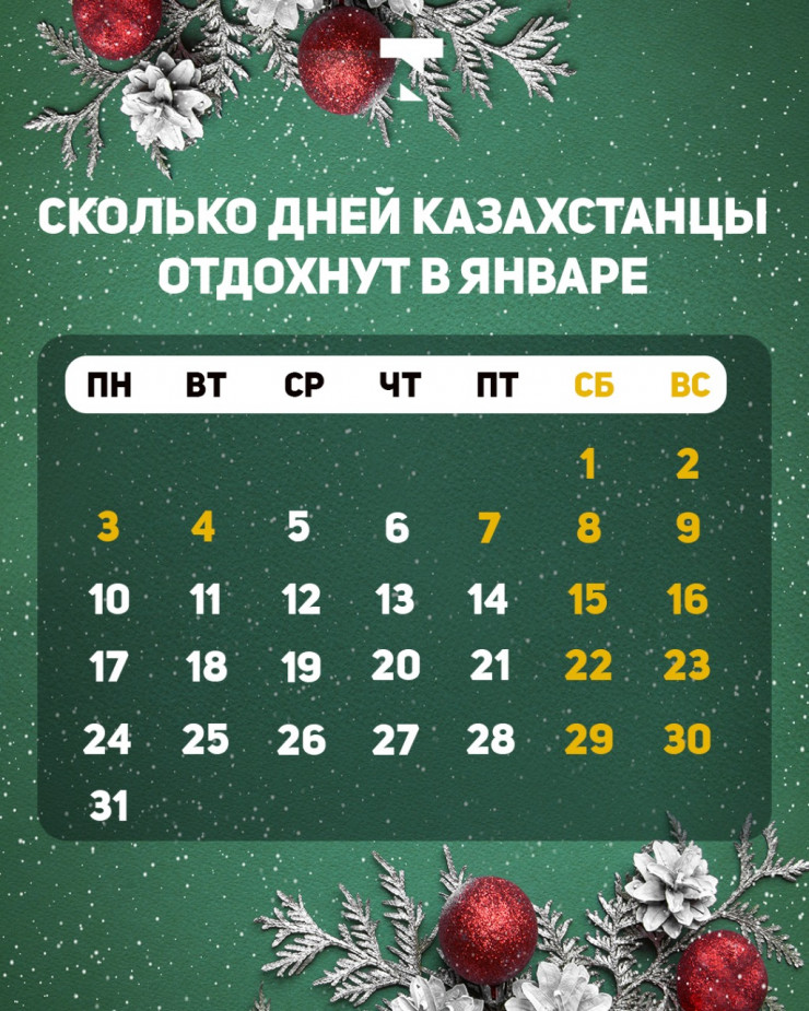 В первый месяц 2022 года казахстанцев ждут 13 выходных дней при пятидневной рабочей неделе, передает Tengrinews.kz.
