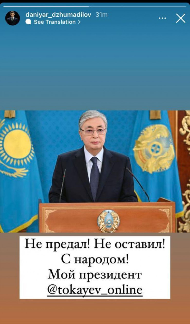 Известный шоумен и капитан команды КВН "Спарта" Данияр Джумадилов опубликовал в Instagram Stories фото Касым-Жомарта Токаева.