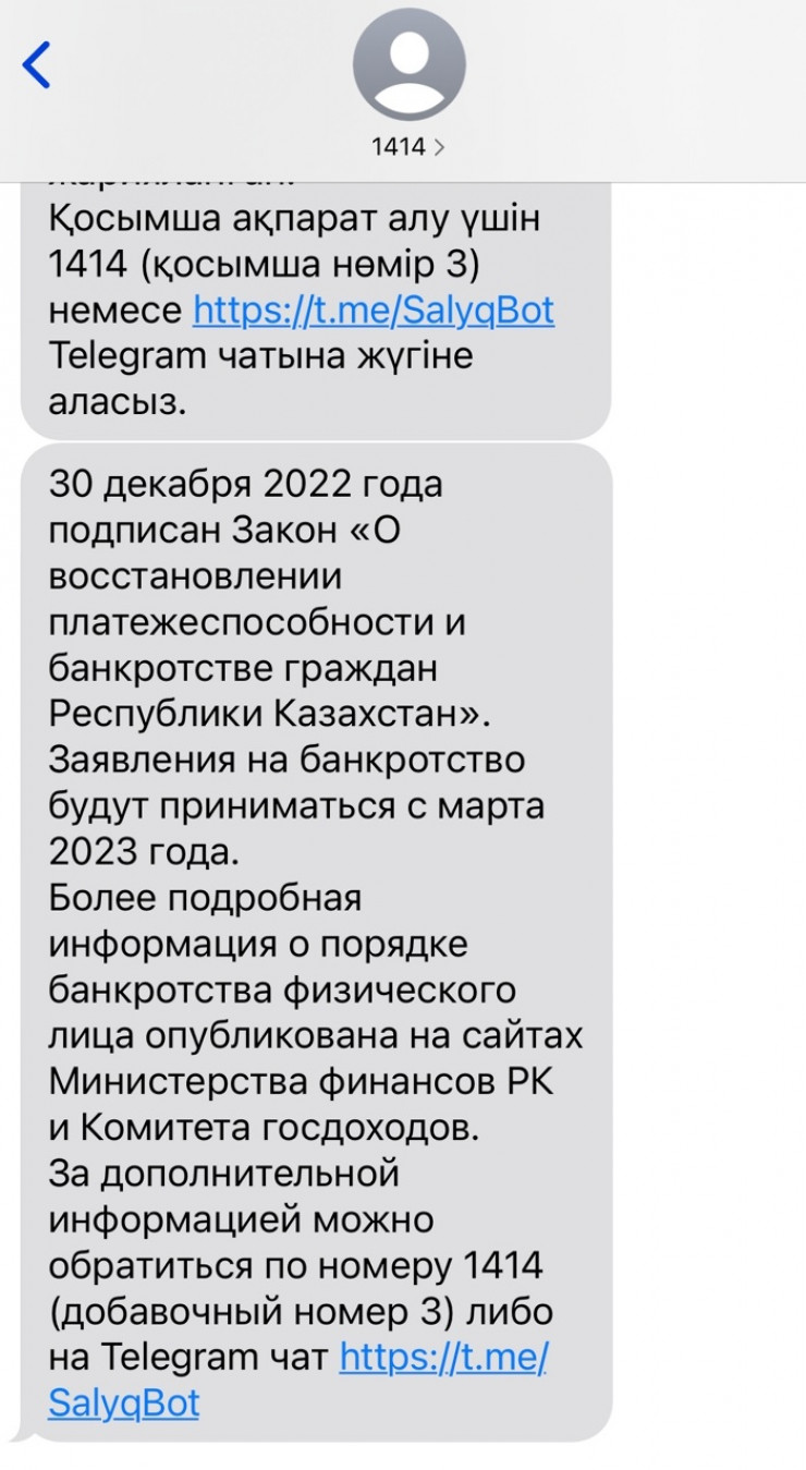 В рассылке от номера 1414 указывается, что закон "О восстановлении платежеспособности и банкротстве" был подписан в Казахстане 30 декабря, а заявления на банкротство будут приниматься с марта 2023 года.